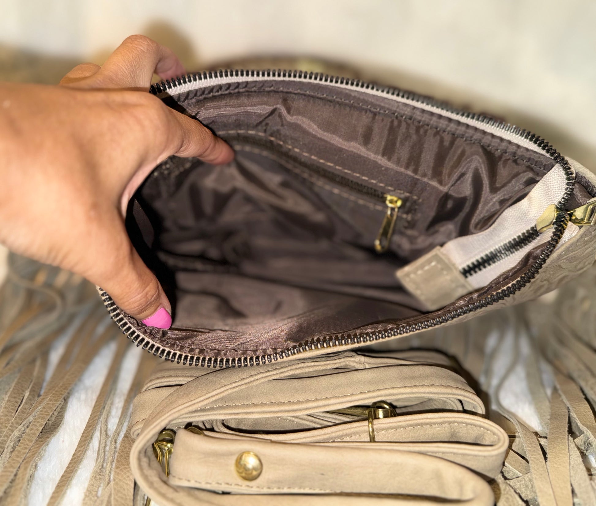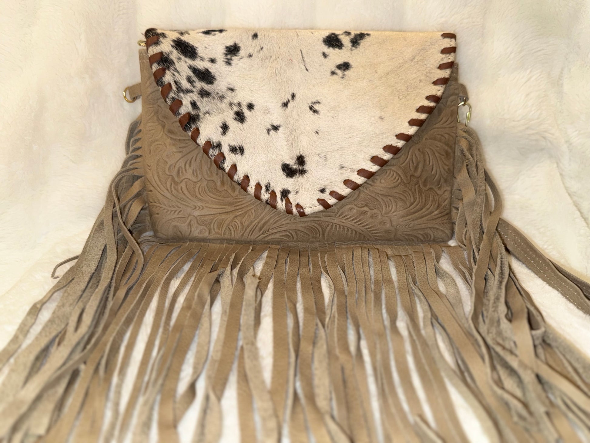 Featuring a genuine cowhide flap with natural speckling, this clutch is paired with beautifully hand-tooled leather in a soft sand-toned hue. Long suede fringe adds movement and texture, while the back zip pocket offers practical storage without sacrificing style. Finished with D-rings for versatile wear, this piece blends function with handcrafted artistry.
