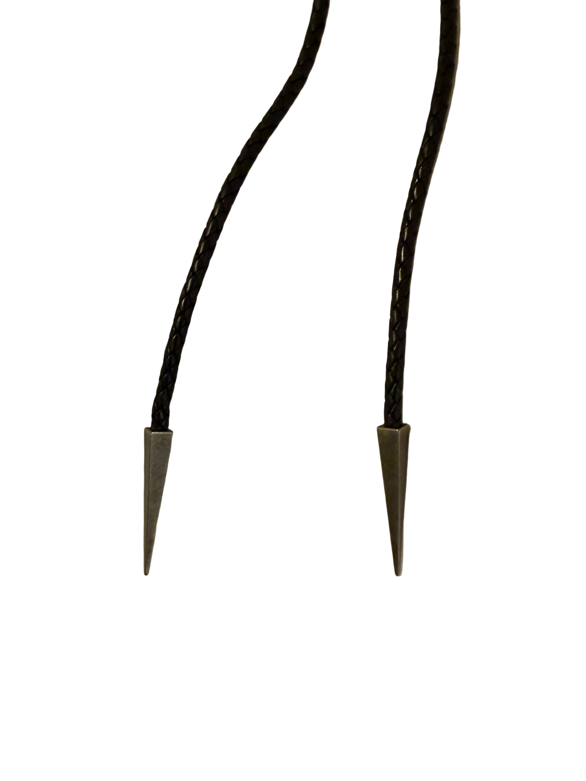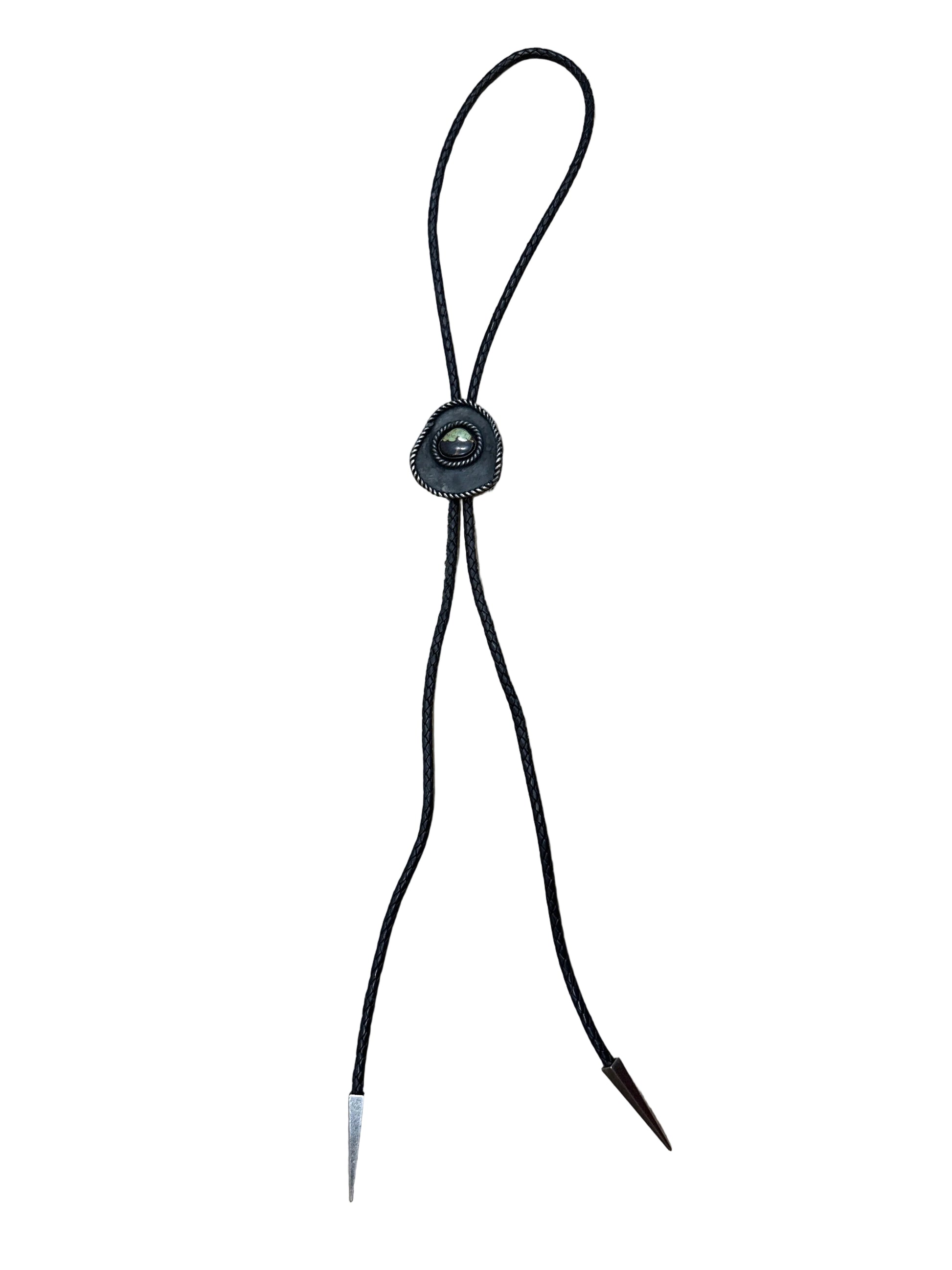 A bold statement piece for the modern outlaw. This handcrafted bolo features a rich Blackjack Turquoise stone set in sterling silver, framed by twisted rope detailing and mounted on a matte black sombrero-style leather backdrop. The deep, earthy tones of the stone echo desert nights, card tables, and choices made under moonlight. Finished with a classic black braided leather cord, this bolo is designed to be worn with intention—whether you’re dressing up denim, leather, or letting it stand alone as a power piece.