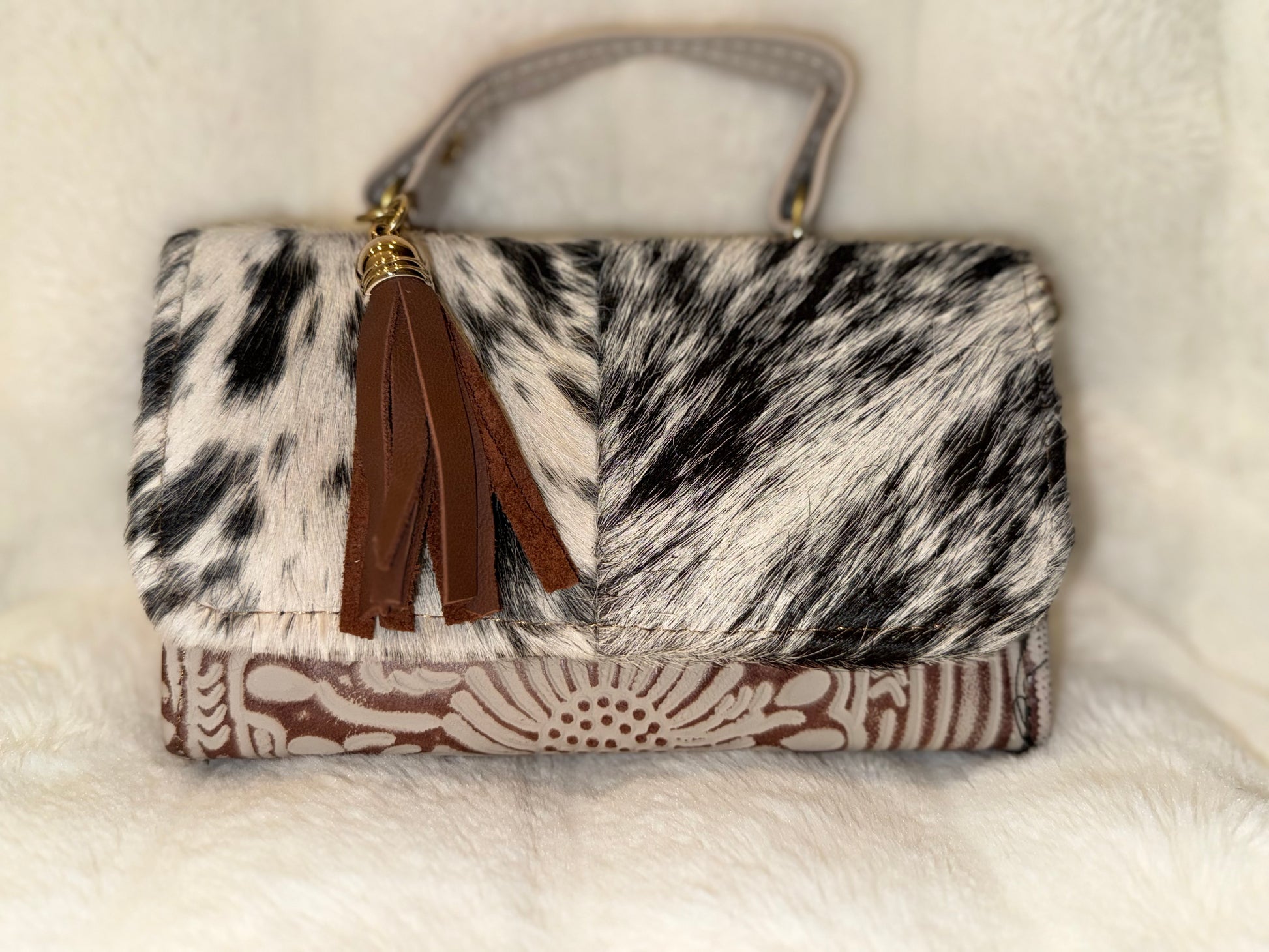 Featuring striking black-and-white cowhide, a supple leather tassel, and a structured foldover design with a top handle, this piece is both functional and unforgettable. No two hides are alike, making every clutch truly unique.