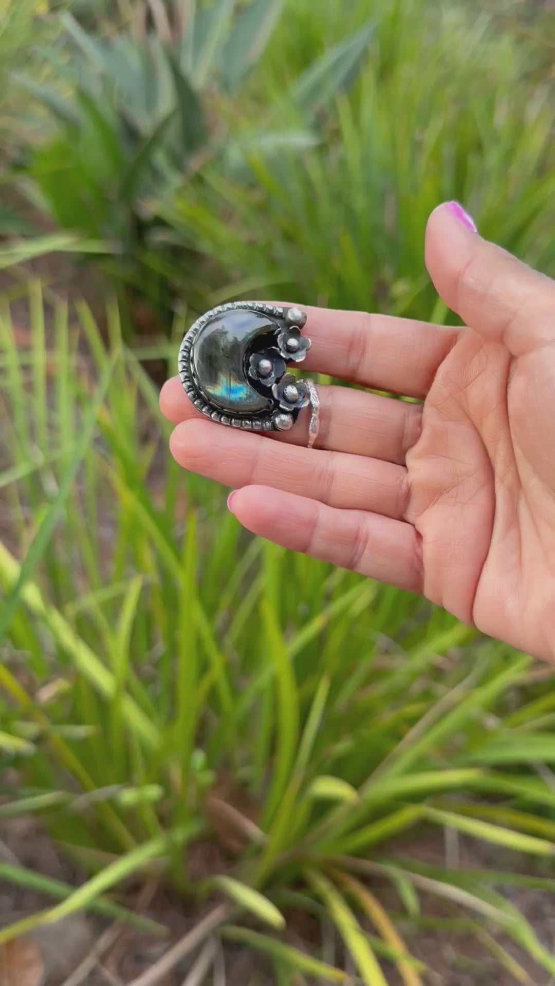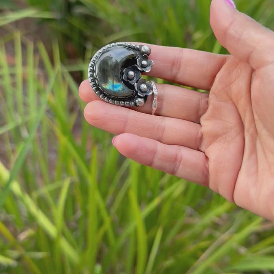 This wild beauty is forged in sterling silver and crowned with a flash of labradorite that shifts like lightning behind clouds.