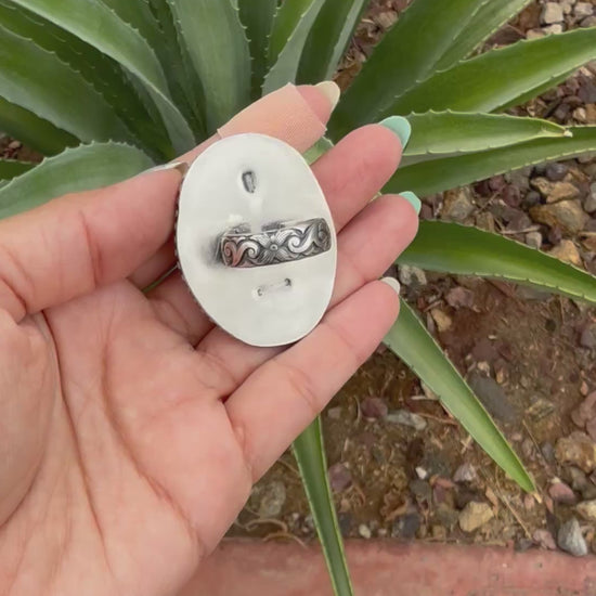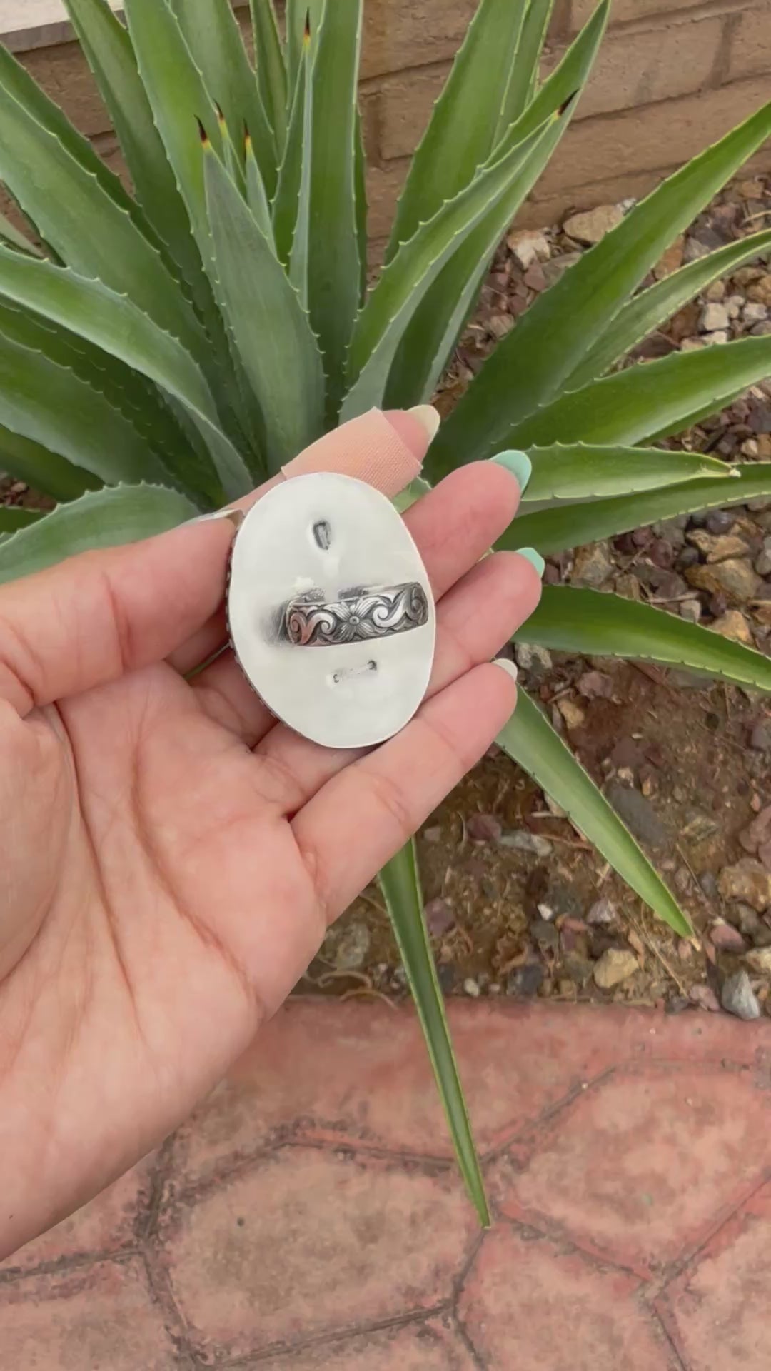 Harnessing the power of the desert and the wisdom of the wild, this one-of-a-kind size 8 statement ring features genuine elk antler inlaid with a glowing turquoise crescent moon. Set in sterling silver with handcrafted detailing, this piece symbolizes protection, intuition, and deep connection to nature. Elk antler represents strength and spiritual renewal, while turquoise is known as the stone of healing and good fortune—making this ring a powerful talisman for anyone who walks between earth and sky.