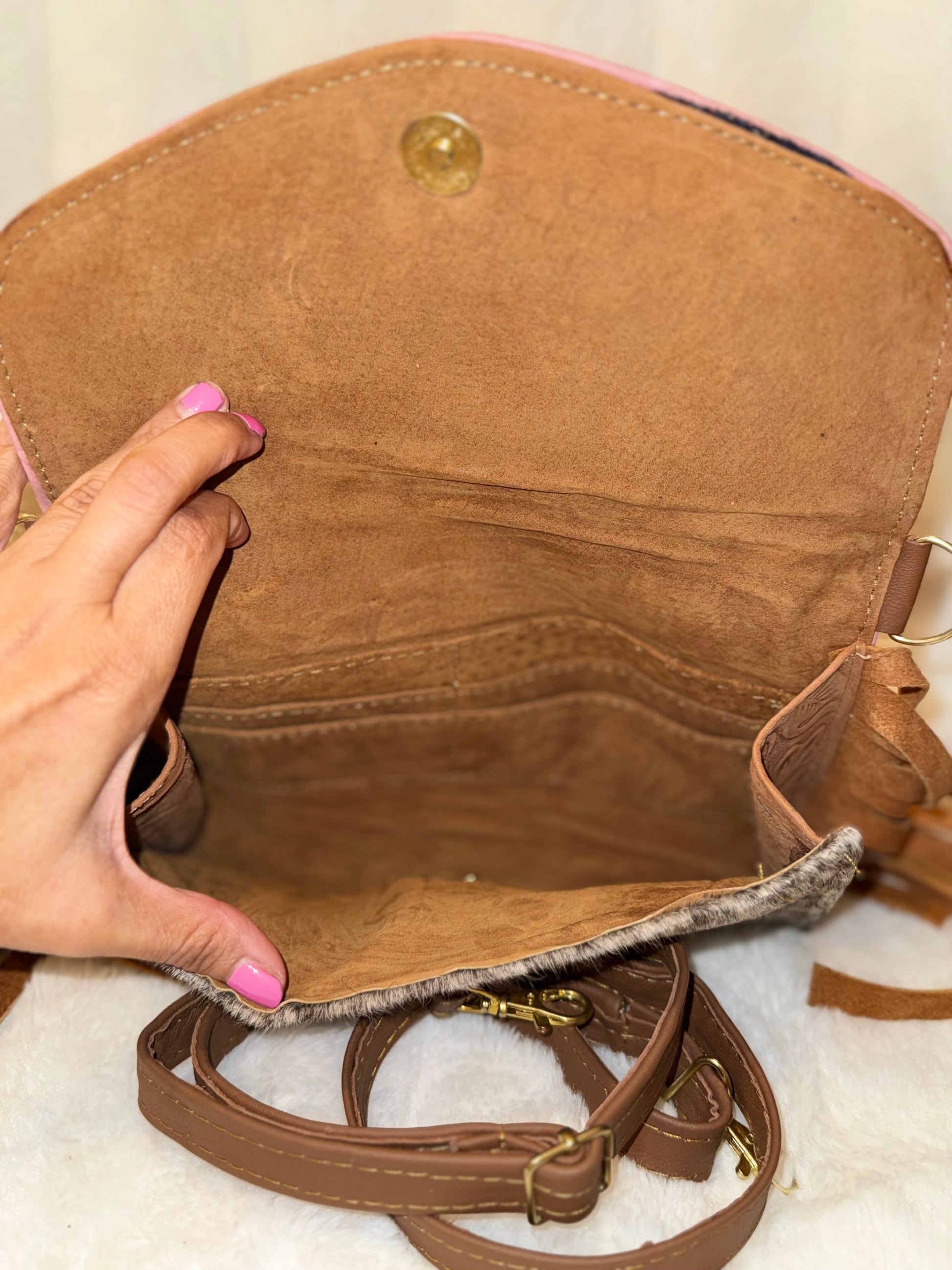 Featuring a hand-tooled dusty-rose leather flap with flowing floral detail, this clutch is grounded by genuine cowhide and finished with long suede fringe that sways with every step. Designed with D-rings for versatile styling, it’s made to carry effortlessly from day to night.