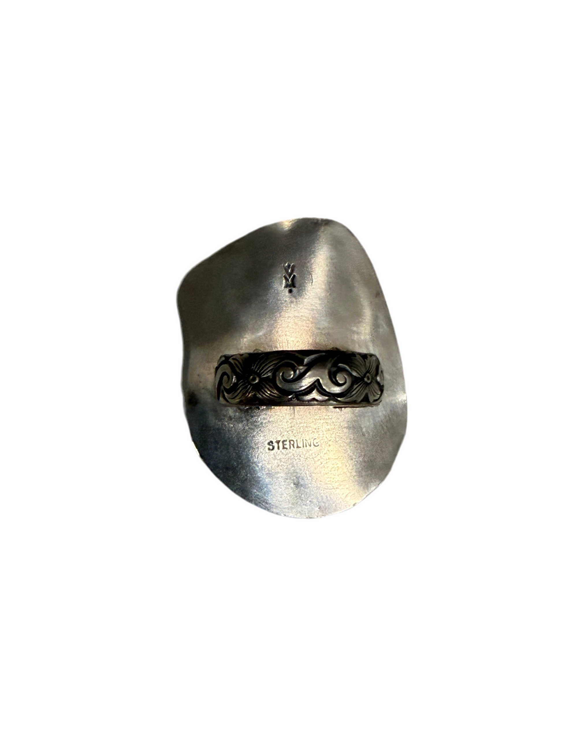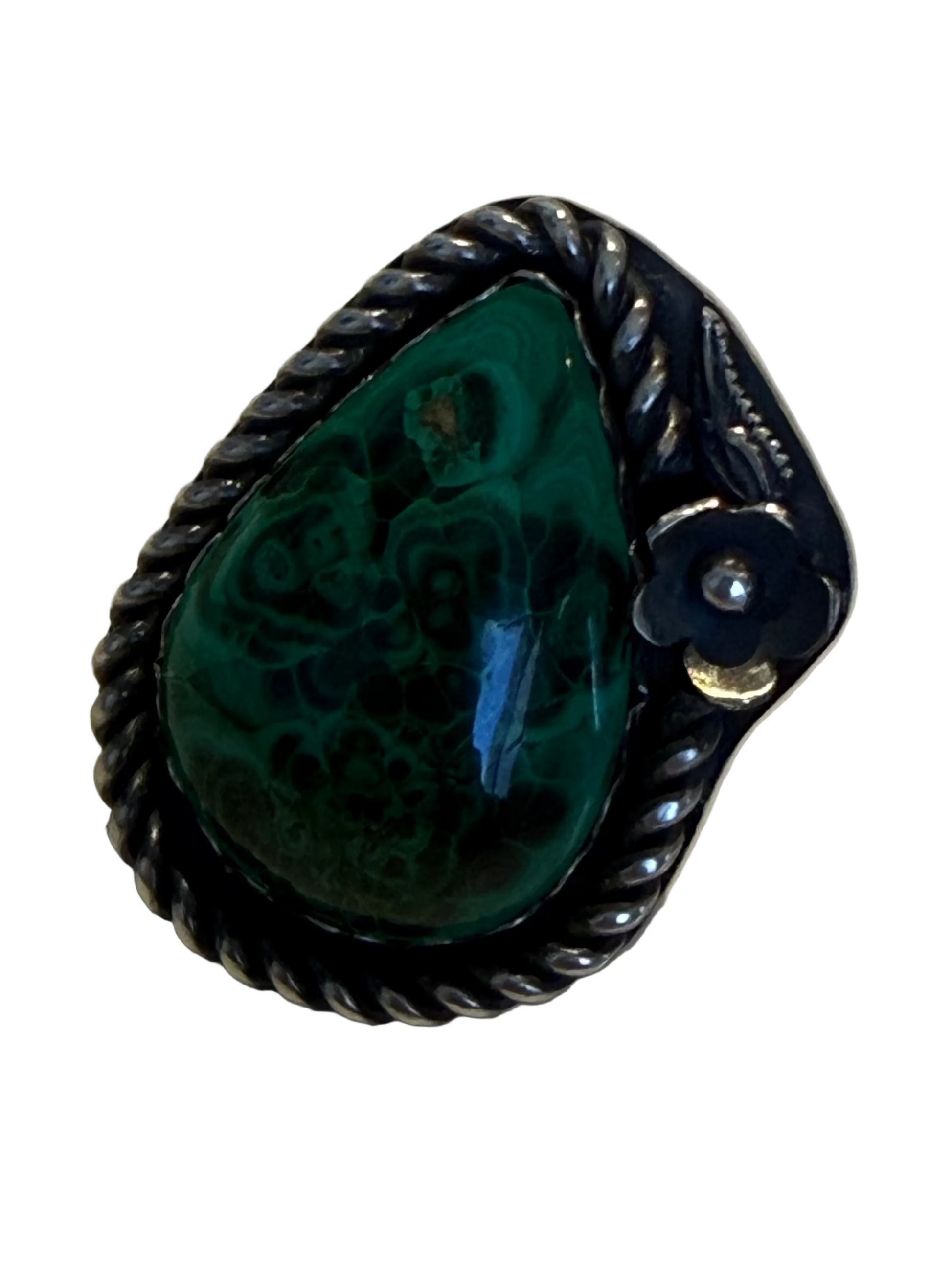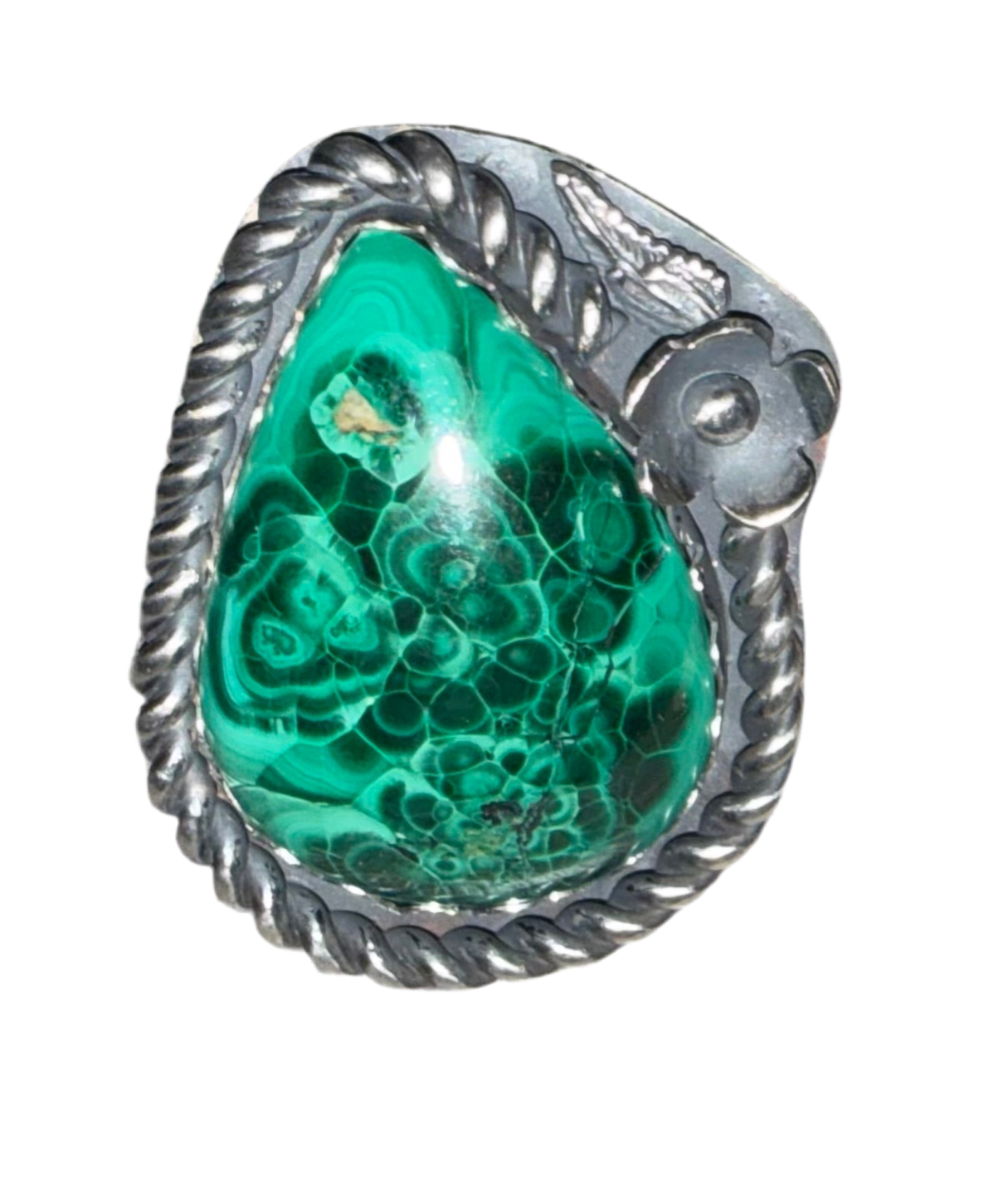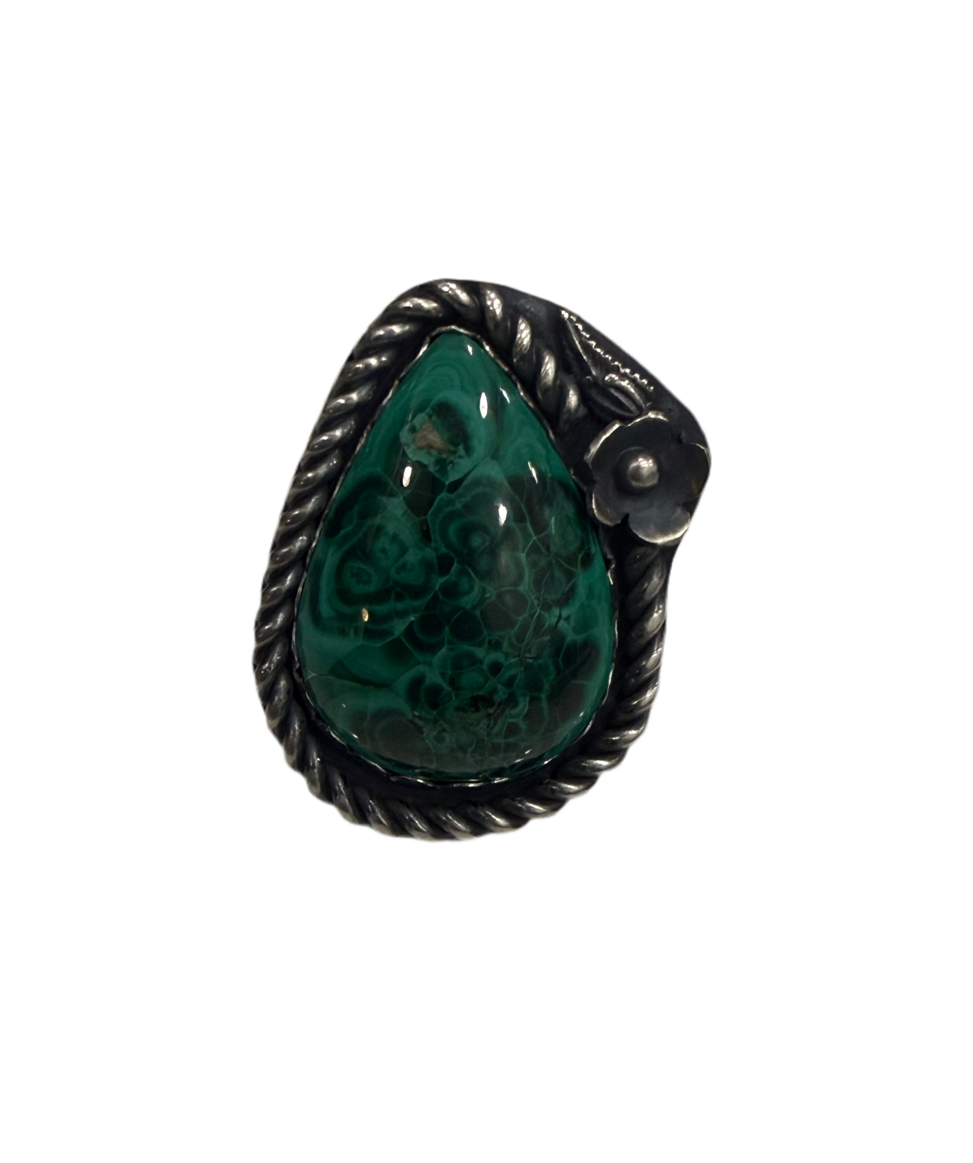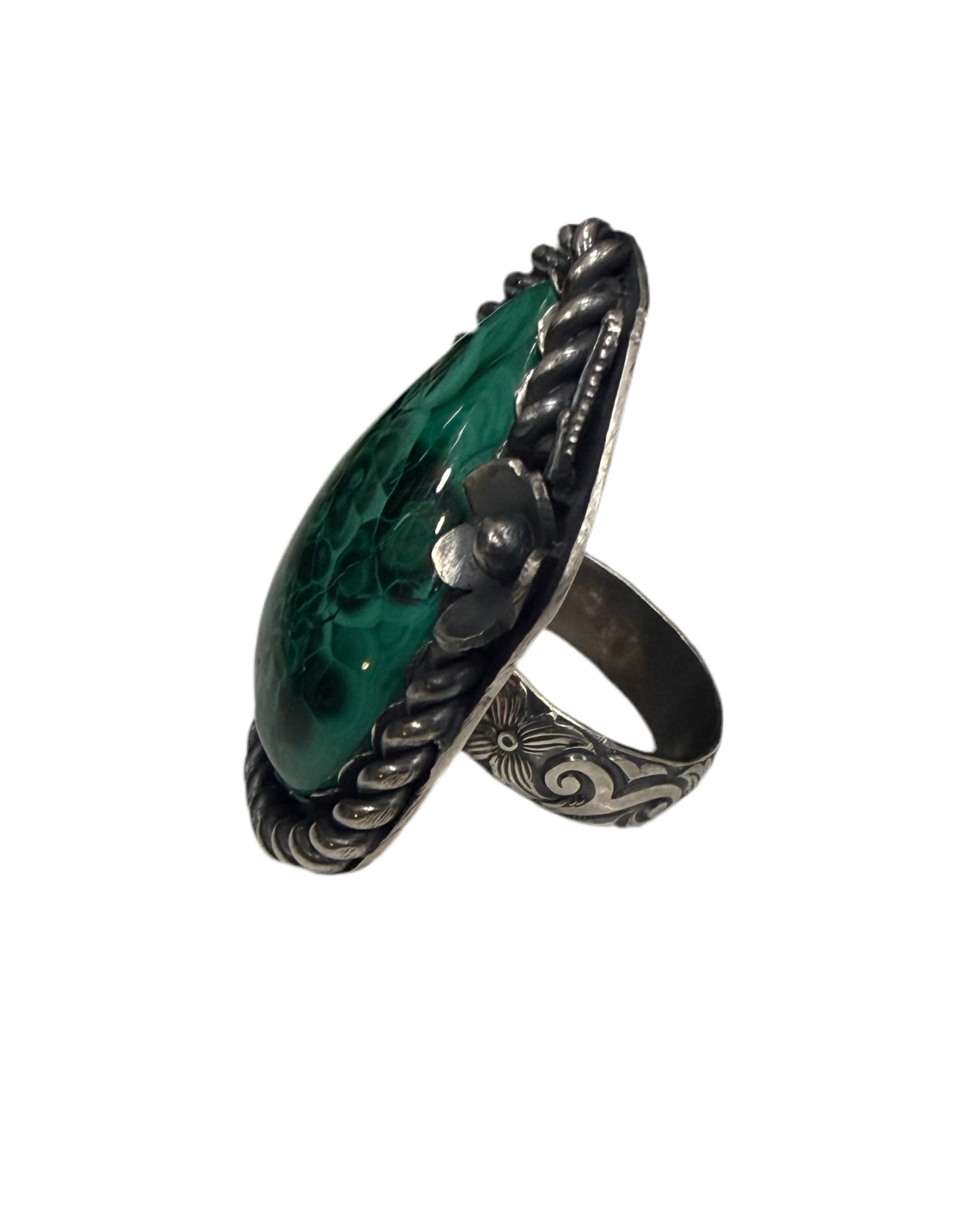 Bold, grounding, and undeniably powerful, The Green Goddess features a richly patterned malachite set in handcrafted sterling silver. The stone’s deep emerald swirls and natural banding feel almost alive—like ancient forest energy captured in stone. Framed with a twisted rope border and accented by a subtle silver floral detail, this ring balances strength with softness.