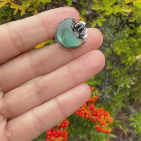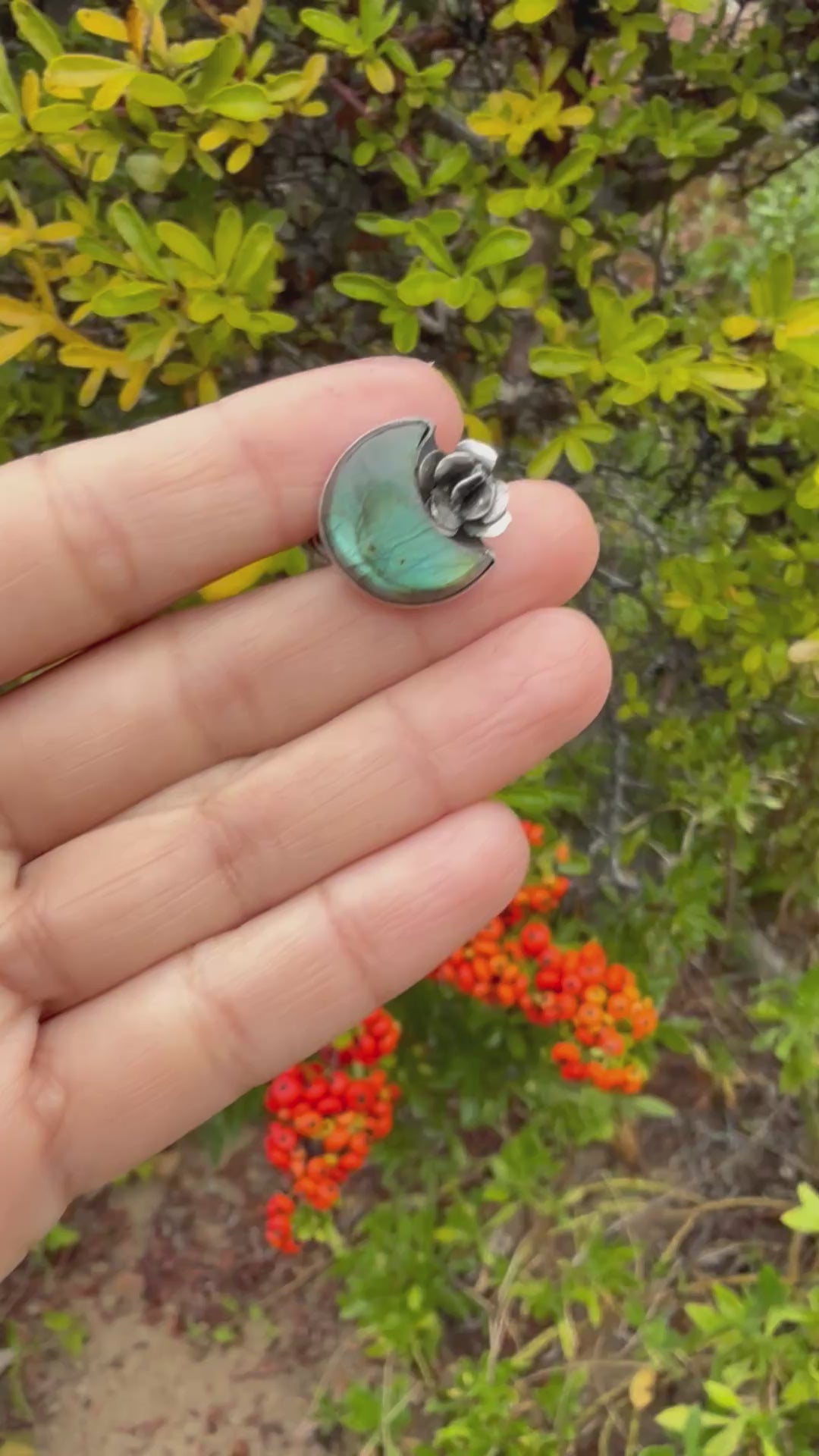 From the Darkside of the Moon collection comes Blue Moon β a delicate yet powerful piece that captures the rare magic of a night when the moon glows a little brighter. Handcrafted in sterling silver with a twisted branch band and a crescent-cut labradorite, this size 5 ring reflects hues of ocean green and celestial blue β like moonlight rippling over water.
