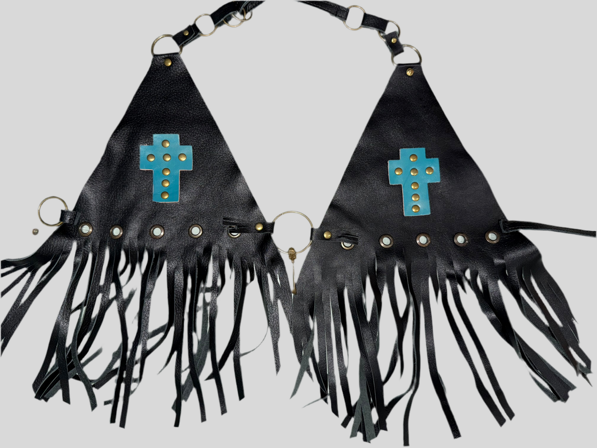 “Black leather, turquoise crosses, and bold fringe — the perfect mix of rugged and refined 🤠✨